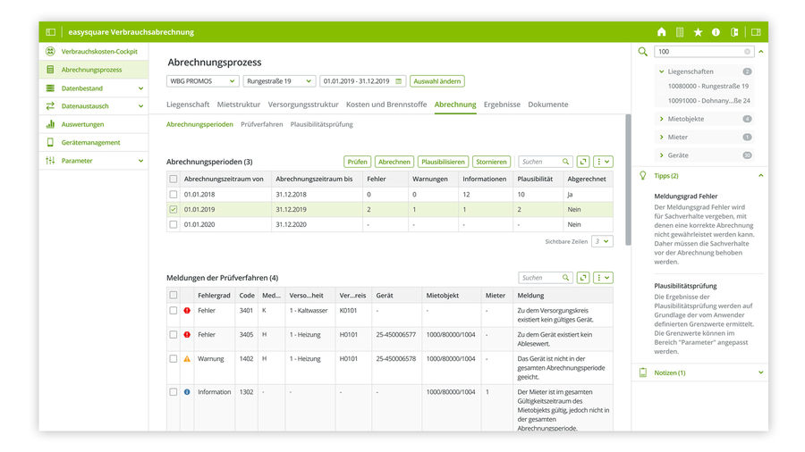 Benefit from an efficient and highly integrative solution for self-determined billing. The easysquare consumption billing (EXAD 2.0) enables properties to be billed in accordance with the German ordinance on the consumption-based billing of heating and hot water costs (HKVO) and VDI 2077 as well as allocation of the costs incurred in the provision of drinking water. At the same time, it allows simple connection to third-party systems as well as device management and mobile data entry on site using the professional app.